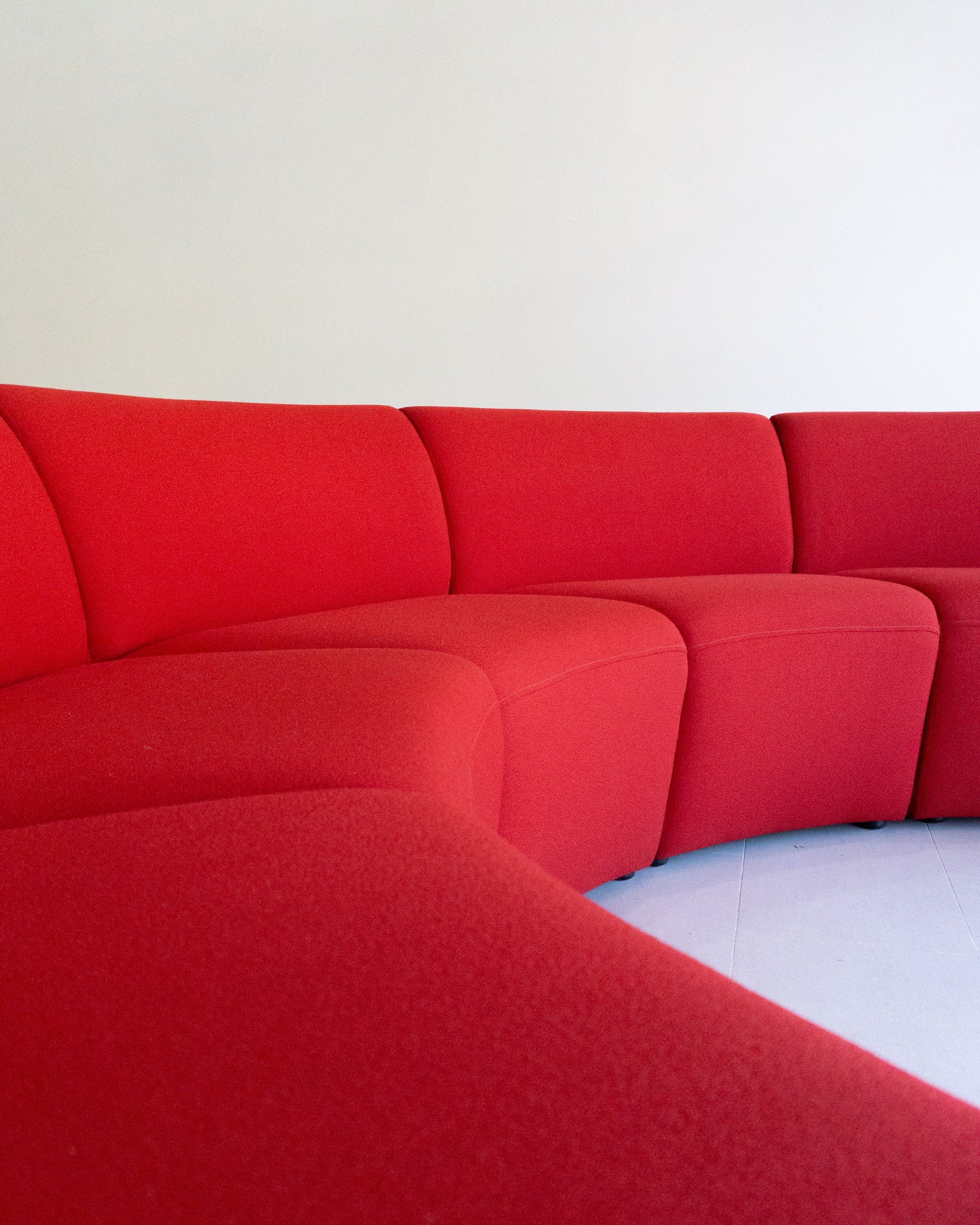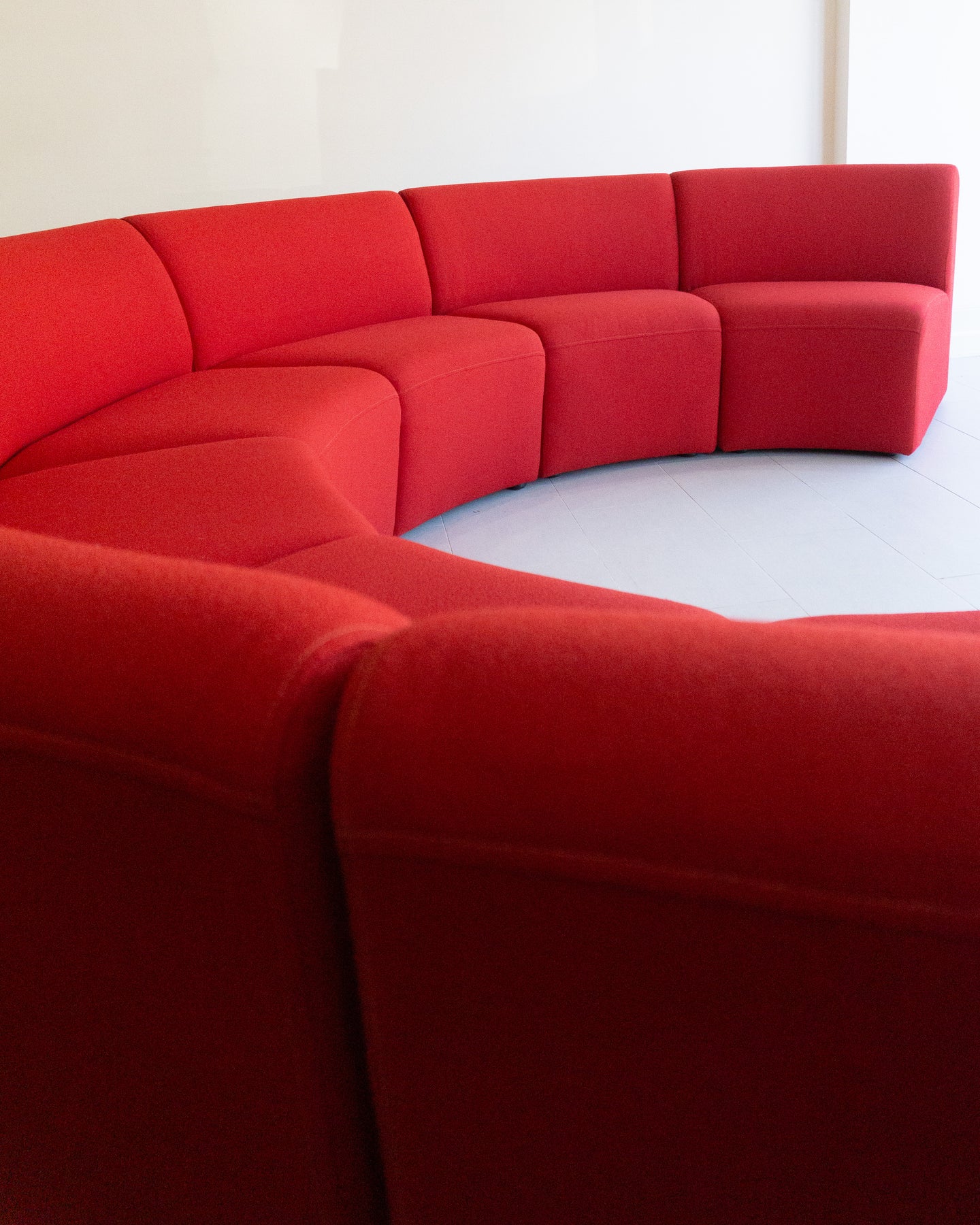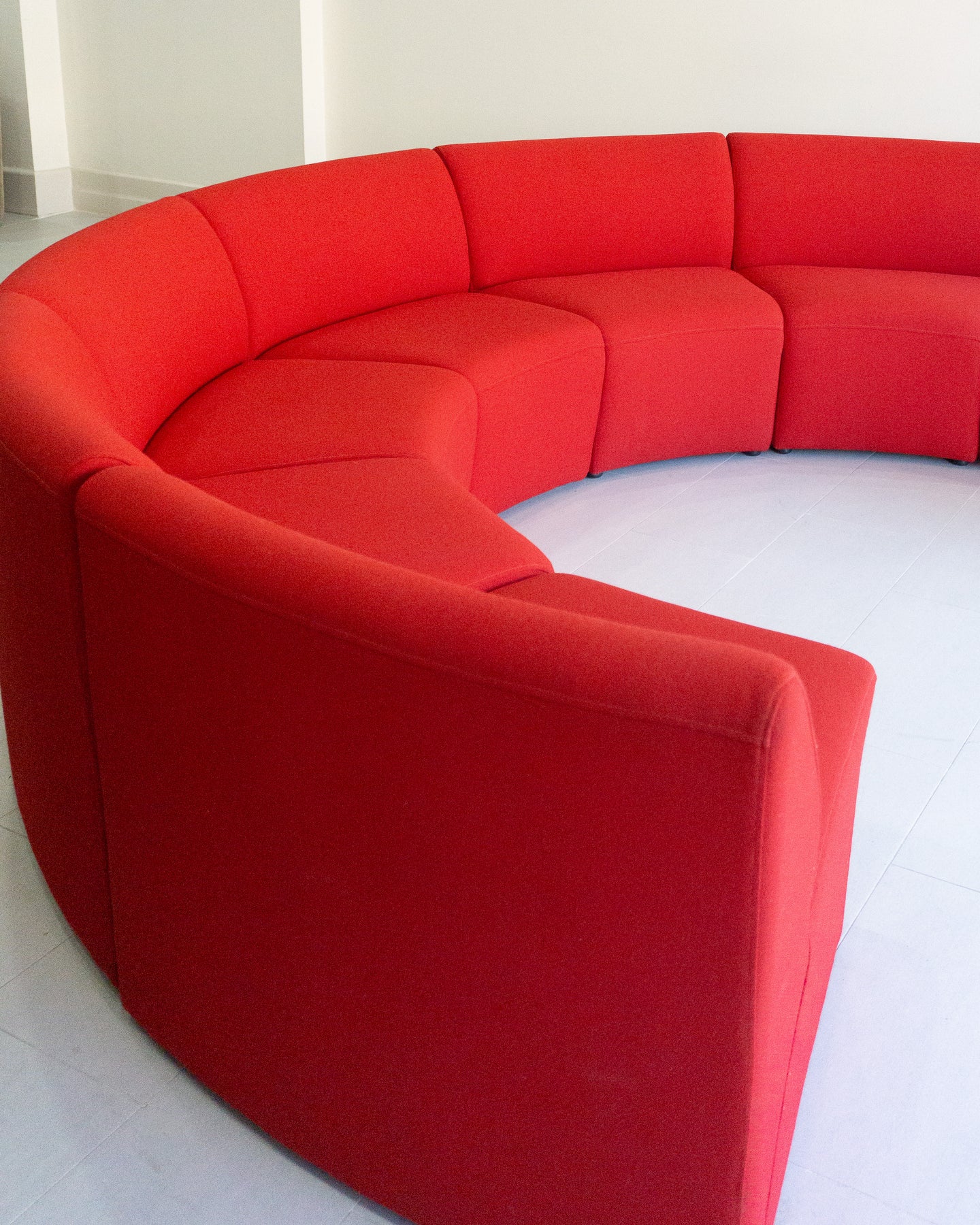 This circular, eight-piece sectional lounge is upholstered in a durable lipstick red fabric, offering both comfort and support ideal for home or office.