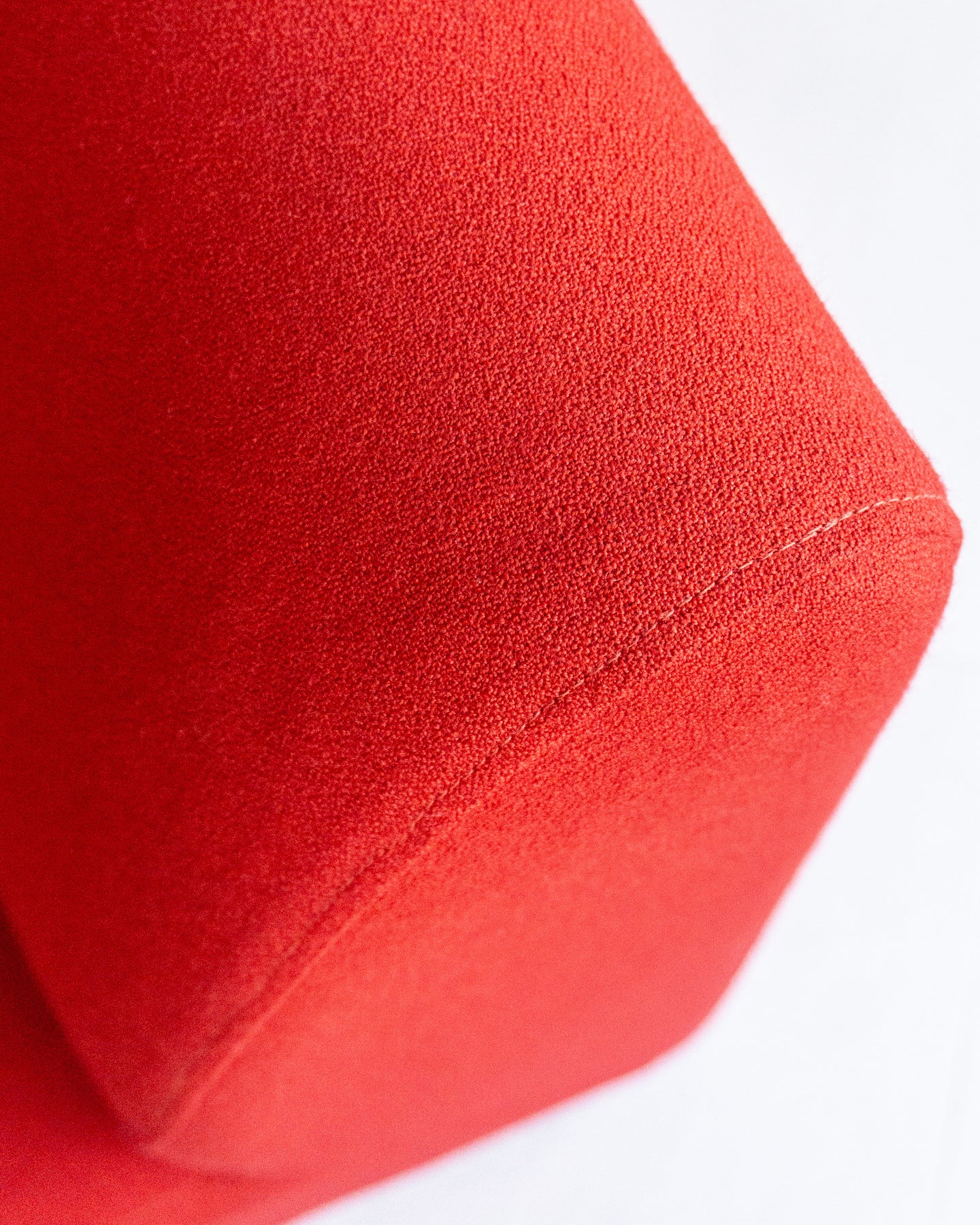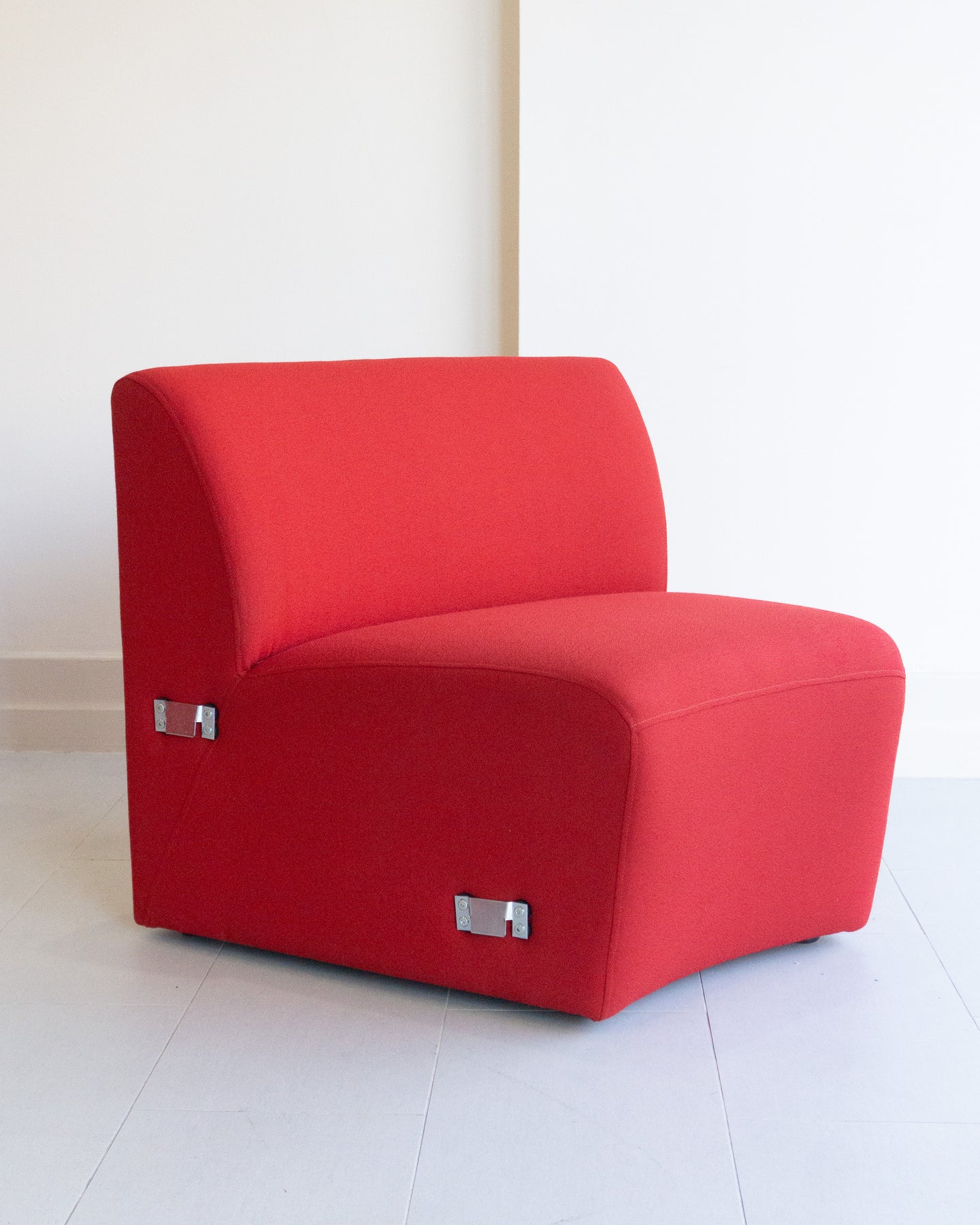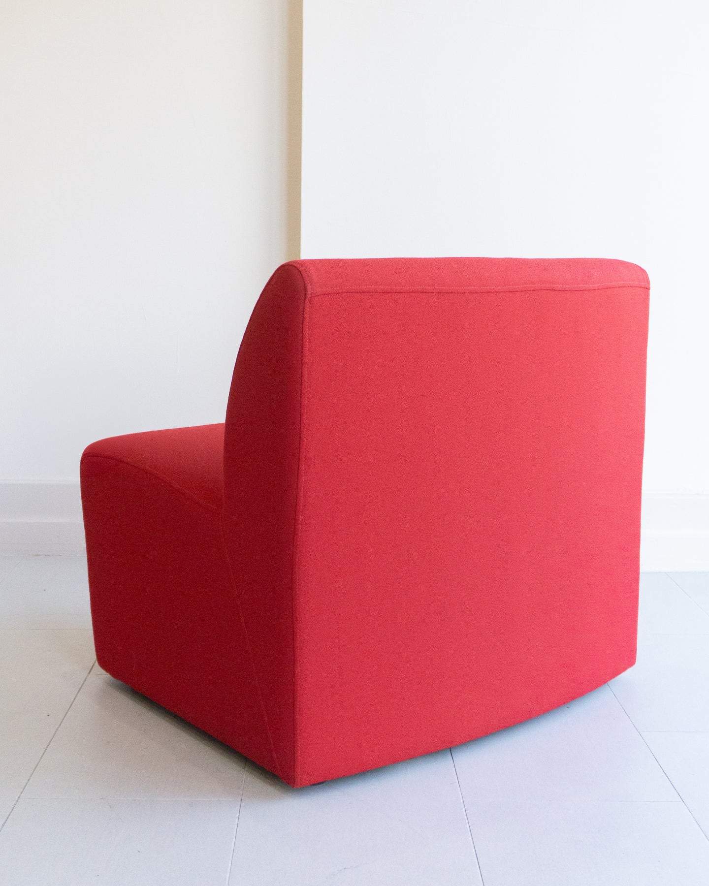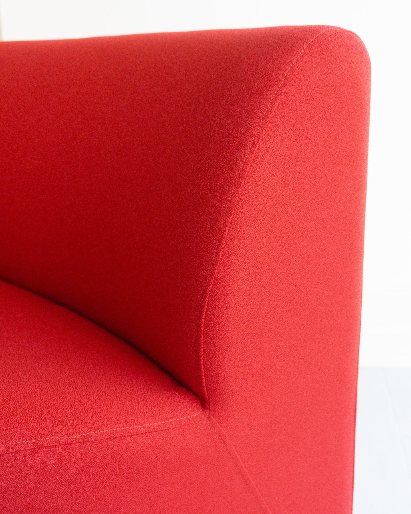 This circular, eight-piece sectional lounge is upholstered in a durable lipstick red fabric, offering both comfort and support ideal for home or office.