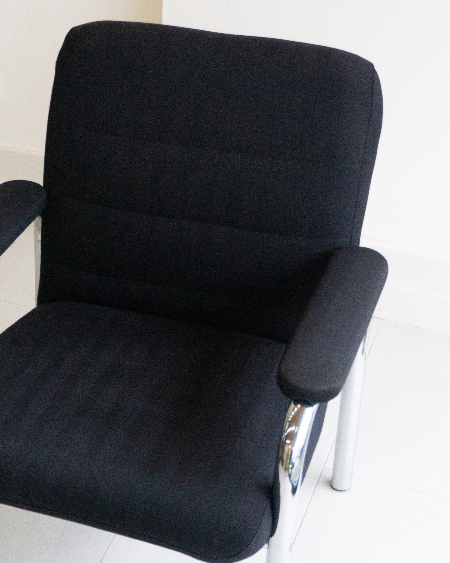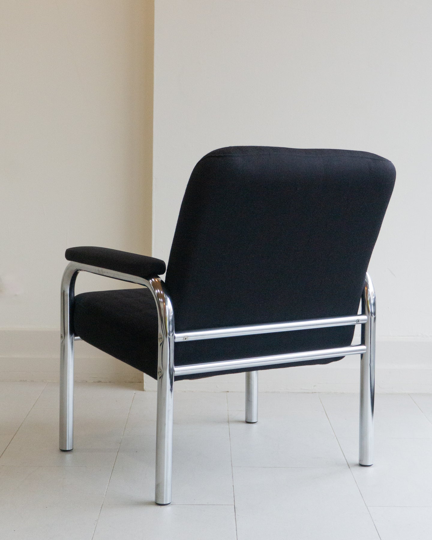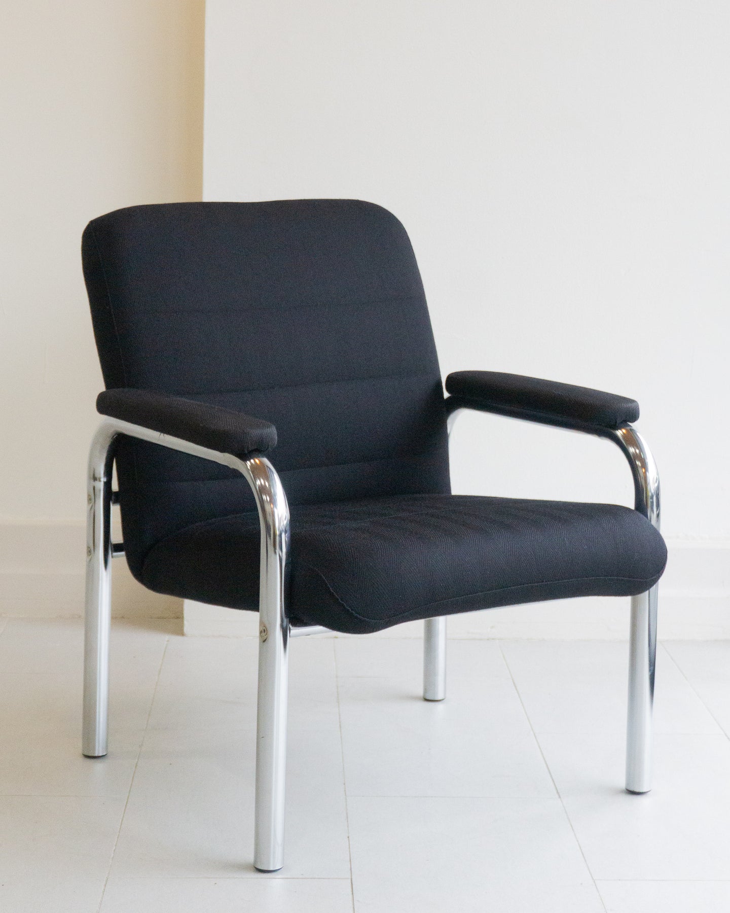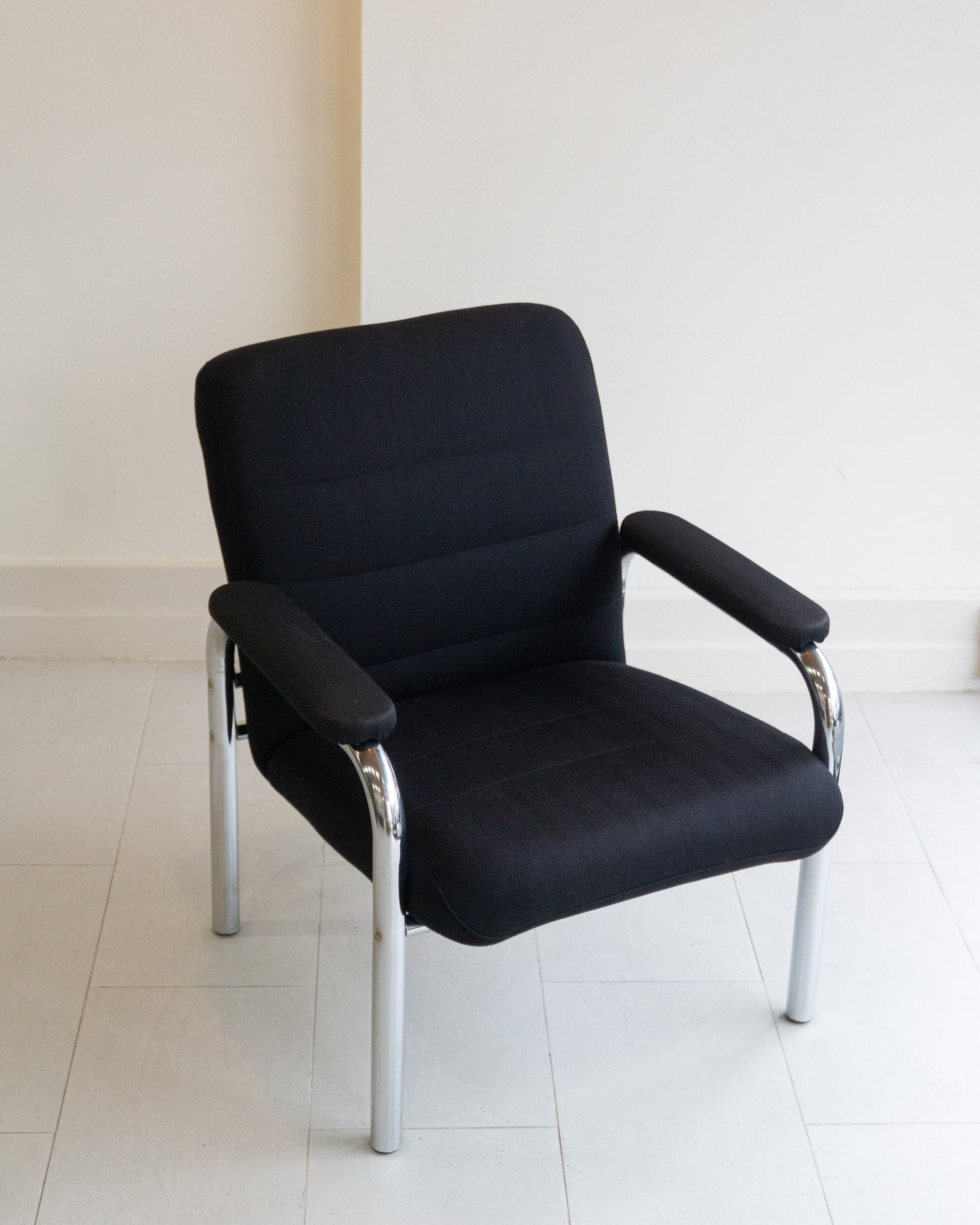 Vintage armchair with black houndstooth upholstery on a tubular chrome frame.