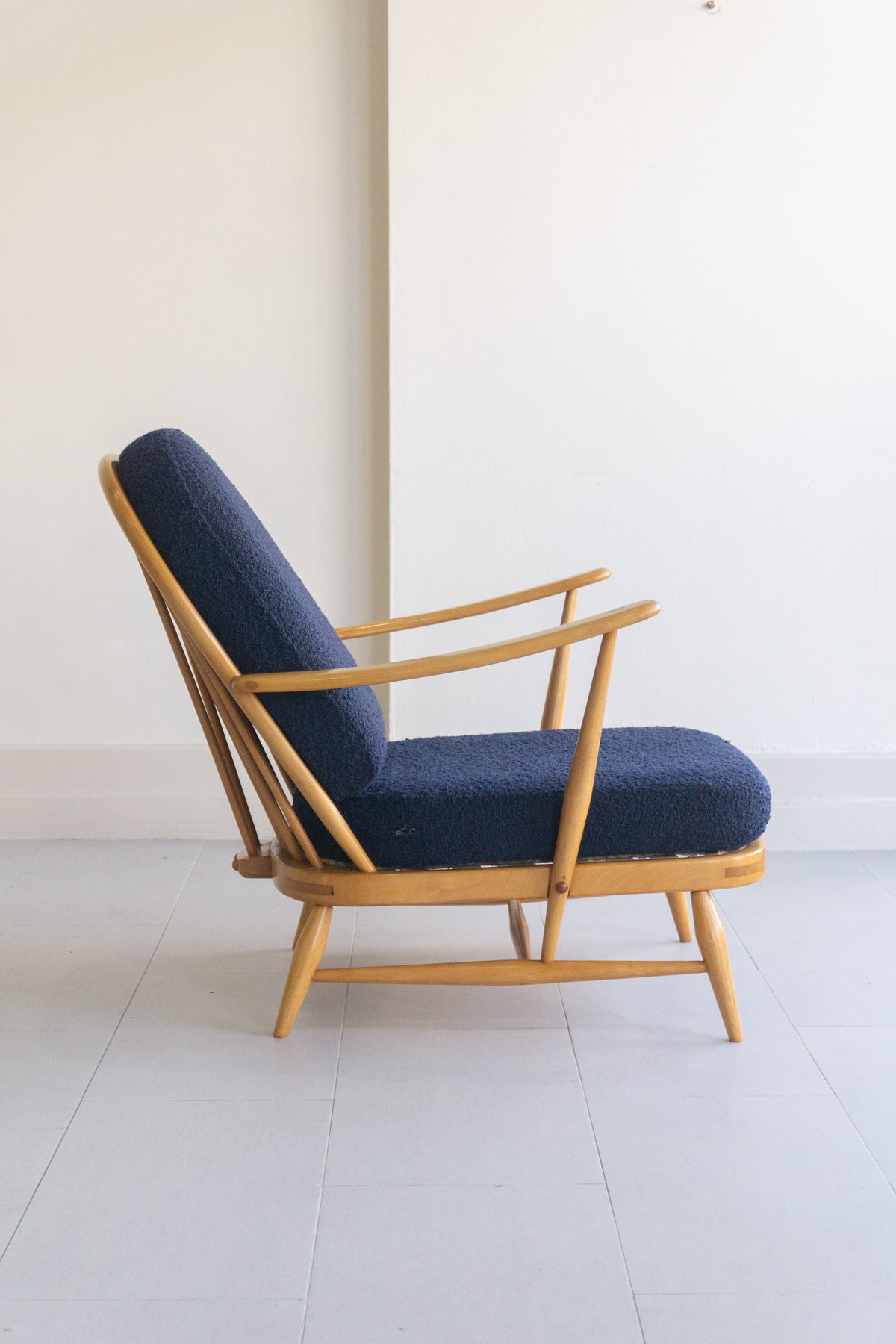 Vintage armchair designed by Lucian Ercolani for Ercol, featuring a blonde Beech wood frame with traditional spindle details and curved armrest. The cushions were reupholstered a few years ago in a blue boucle.
