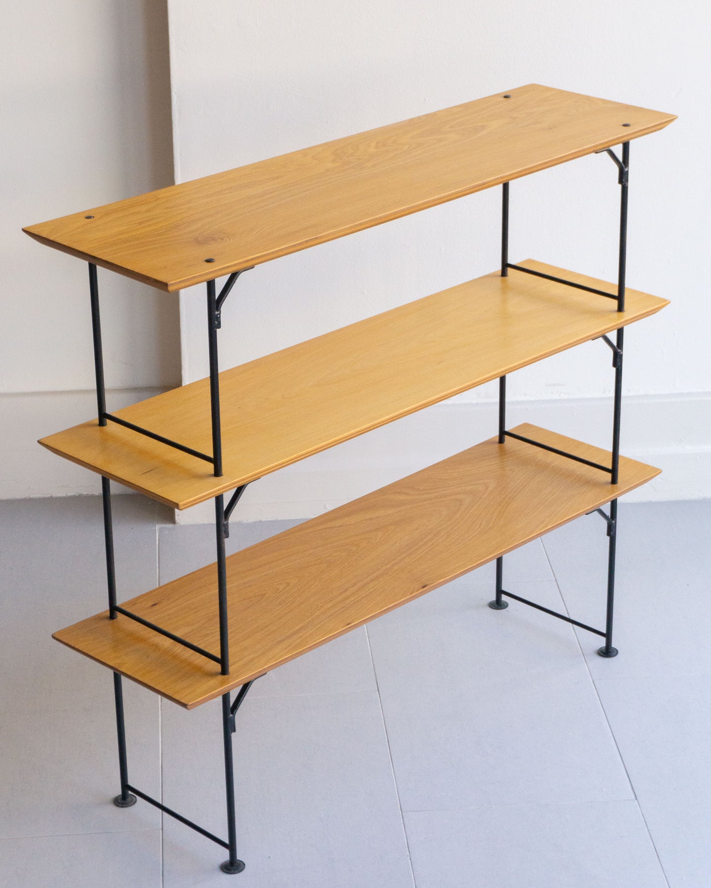 Mid-century countertop shelving unit with steel rod ladder system and oak veneer shelves